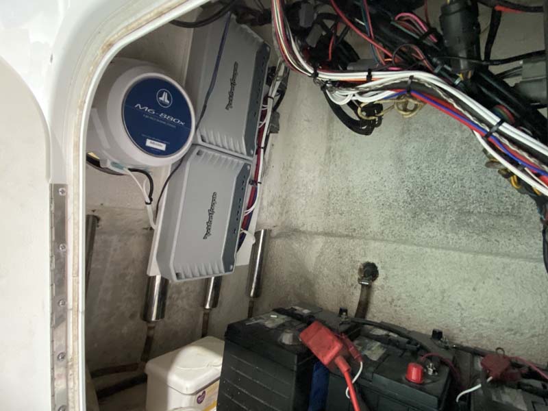 Over the many M6-880 installations we have done, we have found that they love lots of power. To make sure we gave the speakers plenty of clean power we used 2 Rockford Fosgate M2-300×4 marine amplifiers. Each of these amplifiers were bridged to a pair of speakers to provide them with up to 230 watts of power per speaker.